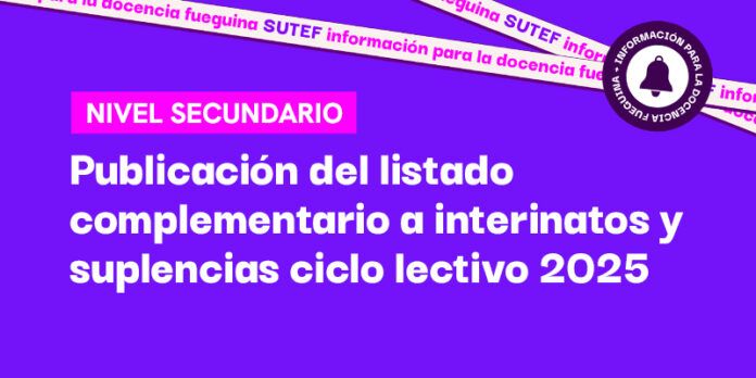 🗓️ Las representantes gremiales de SUTEF en la Junta de Clasificación y Disciplina del Nivel Secundario informan que a partir del día 27 de Mayo del 2025 se realizara la publicación del listado complementario para aspirantes a Interinatos y Suplencias Ciclo Lectivo 2025, en la página del Ministerio de Educación.
