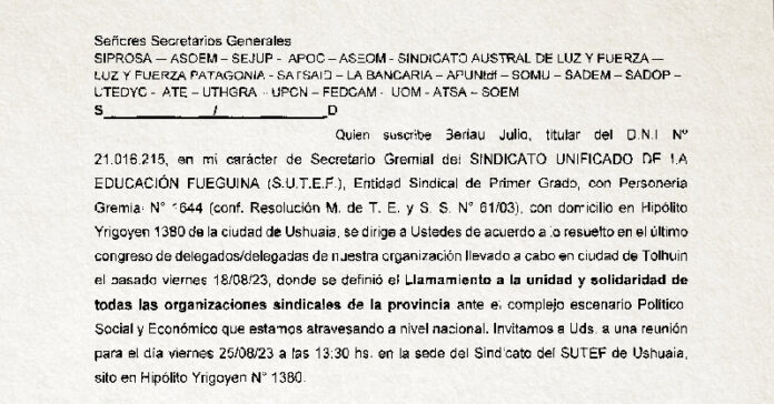 Dando cumplimiento a las resoluciones del último Congreso Provincial de Delegadas y Delegados del SUTEF, el pasado 18 de agosto, nuestra organización realizó un llamamiento a la unidad y solidaridad de todas las organizaciones sindicales de la provincia ante el complejo escenario político, social y económico que estamos atravesando a nivel nacional.