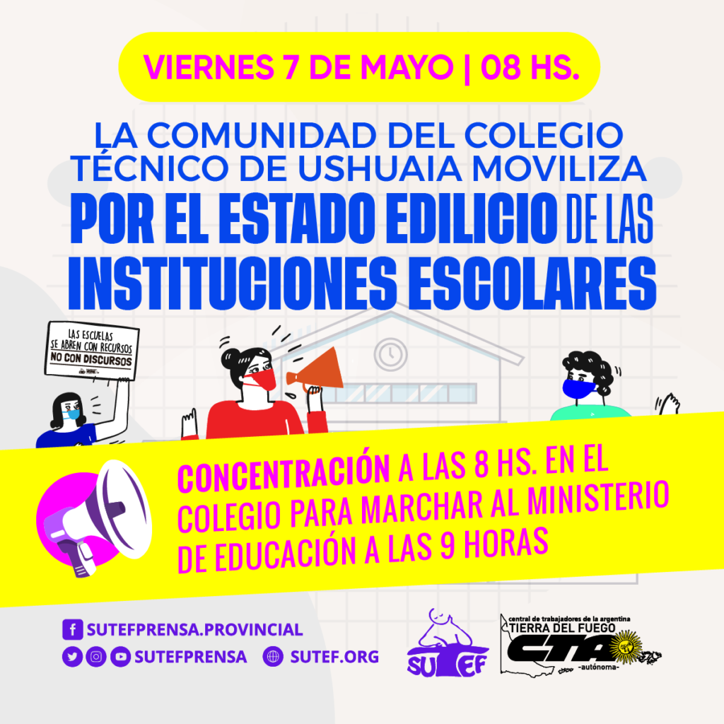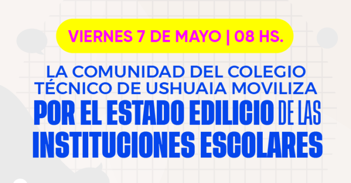 Debido al mal estado edilicio de la institución escolar, la comunidad educativa del Colegio Técnico de Ushuaia se moviliza este viernes 7 de mayo. La concentración es a las 8 hs. en la puerta del Colegio para luego movilizar al Ministerio de Educación a las 9 hs.
