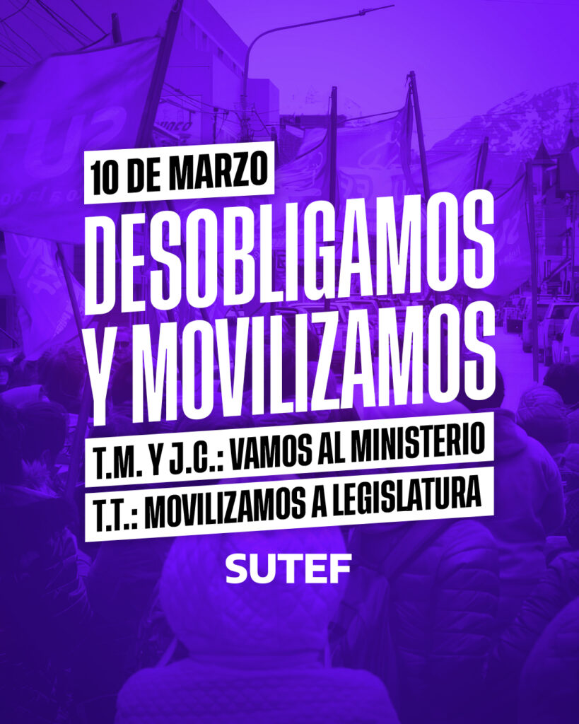 📣 Convocamos a la docencia de todos los niveles y modalidades a participar de las desobligaciones con movilización en cada ciudad. ¡Salgamos a las calles en unidad! ¡Visibilicemos el reclamo de la docencia fueguina!