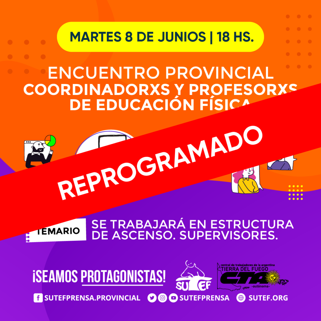 Convenio Colectivo de TrabajoConvocatoriasEncuentro Provincial de Docentes de Modalidad Especial Encuentro Provincial de Docentes de Modalidad Especial publicado el 14 junio, 2021 FacebookTwitterPinterestWhatsAppEmailImpresiónTelegramCopy URL ♦️ SUTEF convoca💬 Encuentro Provincial de Docentes de Modalidad Especial🗓 Martes 15 de Junio | 18 Hs.📝 Temario: Se trabajará en cargo Maestrx Tutxr Especial. ¡Solicitá link para participar!Adriana: 2964-605987Julio: 11-56066032 Últimos artículos Comunicados / Informes / Noticias Solidaridad con la docencia de la Escuela Especial Kayú Chénèn El Sindicato Unificado de Trabajadoras y Trabajadores de la Educación Fueguina (SUTEF) expresa su... 1 noviembre, 2025 Comunicados e informes Informe de mesa paritaria salarial y consulta con la docencia Informe de Mesa Paritaria Salarial Este jueves 30 de octubre, se llevó adelante en la... 30 octubre, 2025 Más publicaciones Convocatorias CCT: reunión provincial con docencia de los Centros Populares de Cultura 🙋♀️ Se convoca a la docencia de los Centros Populares de Cultura a reunión... 2 julio, 2024 Convocatorias CCT: reunión provincial con maestras/os de lengua extranjera inglés 🙋♀️ Se convoca a maestras/os de lengua extranjera inglés de la provincia a participar... 17 junio, 2024 Convocatorias CCT: reunión provincial con bibliotecarias/os de Inicial, Primaria y Modalidades 🙋♀️ Se convoca a bibliotecarias/os de Inicial, primaria y modalidades de la provincia a... 6 junio, 2024