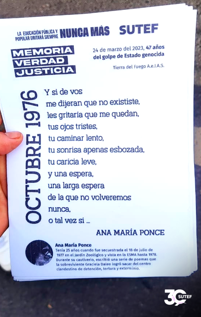 En nuestra provincia atravesamos en la actualidad un proceso de reconocimiento de las víctimas, que durante muchos años por diversos motivos fueron ocultadas a la sociedad y que aún cuesta un gran esfuerzo que la población las reconozca, es el caso por ejemplo de la docente Florencia Rojas, asesinada frente al casino de oficiales de la ciudad de Río Grande , o el caso de Marcela Andrade, una niña también asesinada pero en un control militar en la ruta n.º 3 en cercanía de la Misión Salesiana. Ambos casos resultado de disparos contra los vehículos en los que viajaban por parte de efectivos del batallón de infantería n.º 5.