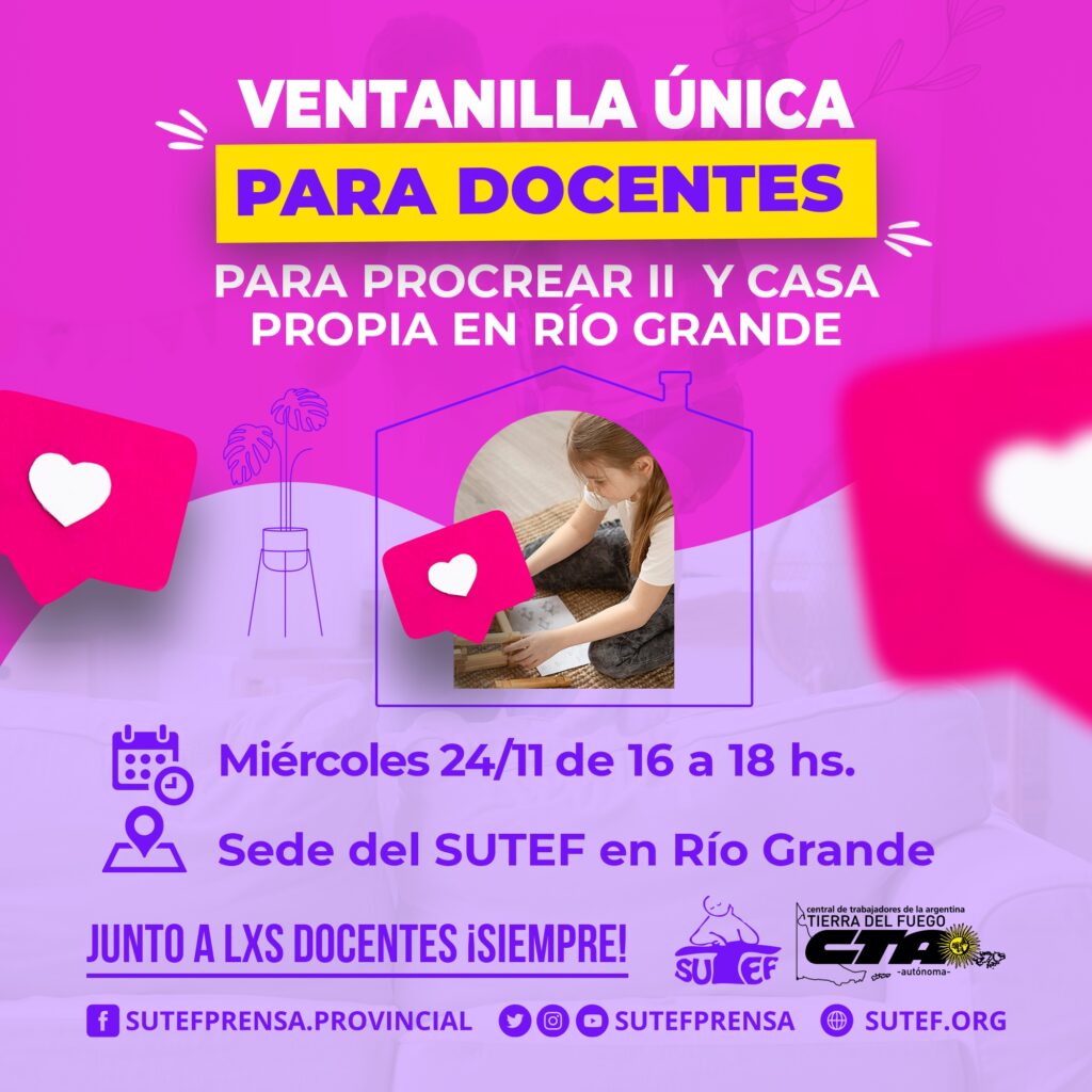 Compañeras y compañeros: en el día de mañana, miércoles 24 de noviembre, funcionará la Ventanilla única para Casa Propia y Procrear 2 en el SUTEF Río Grande.