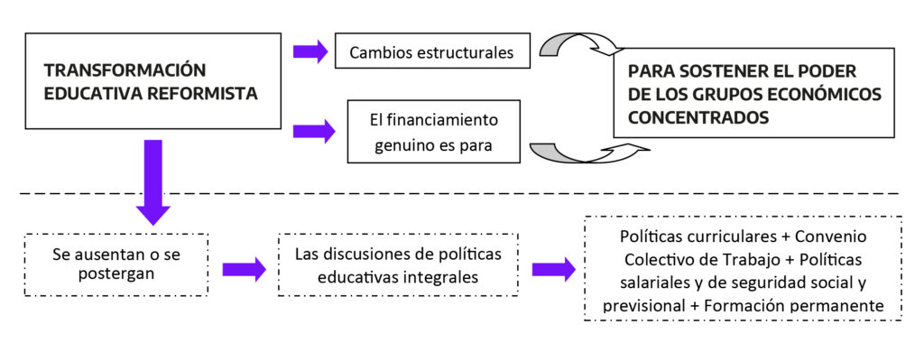 ➡️ Efecto: el resultado final es el sostenimiento del statu quo. Por ejemplo, en la década de los 90, la Ley Federal de Educación modificó las formas organizativas (como los «ciclos educativos»), fragmentando los niveles. Esto se implementó con una lógica que favoreció intereses neoliberales y de nichos de mercado, impidiendo la articulación sistémica real.