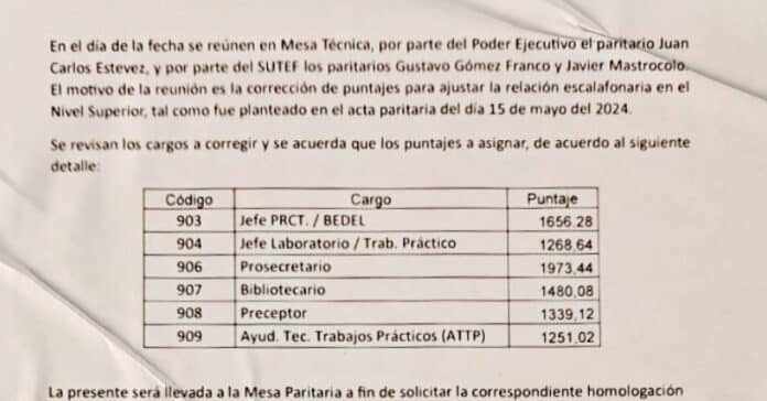 En la Mesa Técnica se abordó la corrección de puntajes de algunos cargos de Nivel Superior para ajustar la relación escalafonaria, planteado por SUTEF en la Mesa Paritaria Salarial del 15 de mayo.