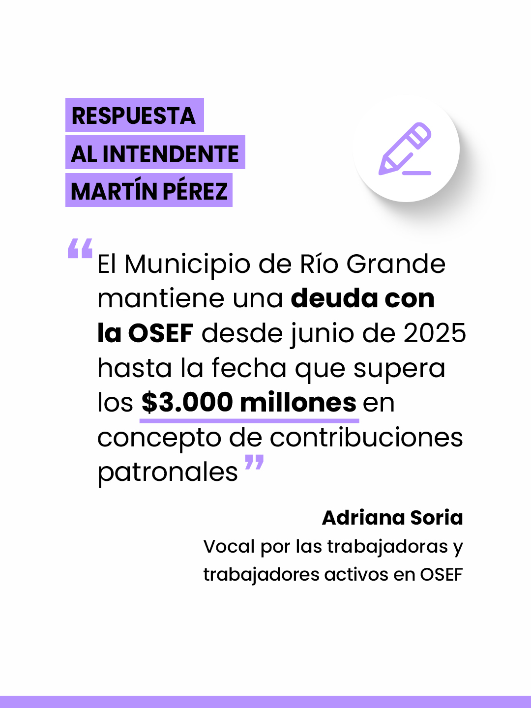 Sobre este punto es necesario ser claros: el Municipio de Río Grande mantiene una deuda con la OSEF desde junio de 2025 hasta la fecha que supera los $3.000 millones en concepto de contribuciones patronales. Esto constituye un incumplimiento concreto.