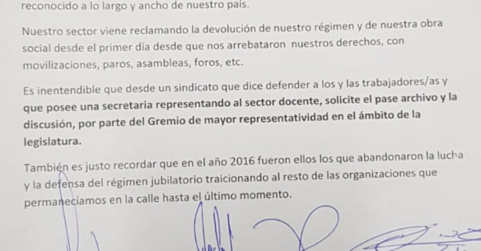 En la carta se detalla que «nuestro sector viene reclamando la devolución de nuestro régimen y de nuestra obra social desde el primer día desde que nos arrebataron nuestros derechos, con movilizaciones, paros, asambleas, foros, etc».