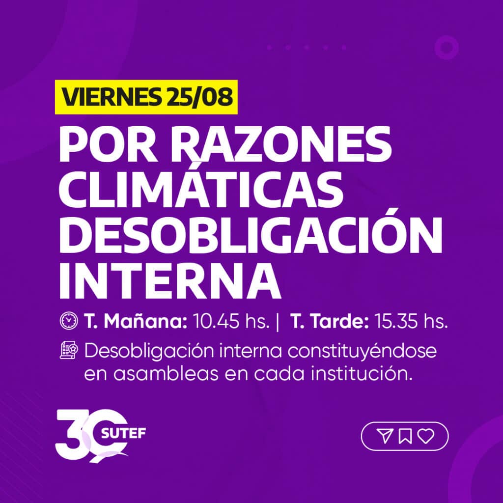 🗓️ Viernes 25/08: desobligaciones internas en los turnos mañana y tarde constituyéndose en asambleas en cada institución.