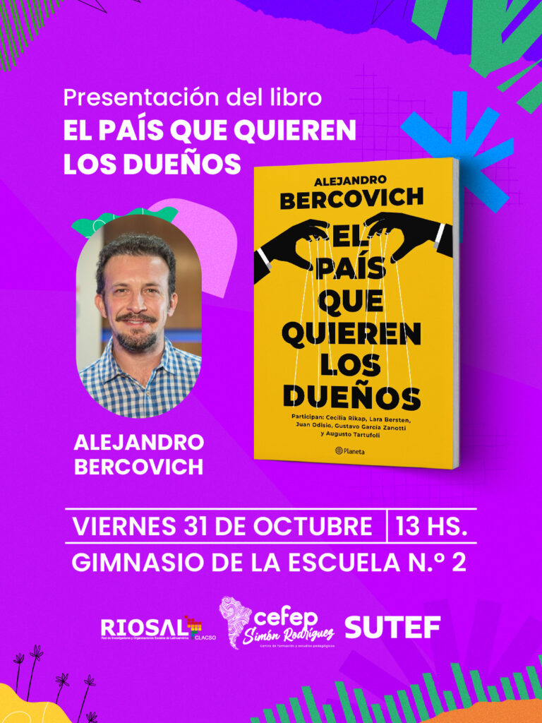 🗓️ El viernes 31 de octubre, en el marco del IX Congreso Provincial de Educación Pública y Popular “Educación con democracia, soberanía e inclusión social” – XV Seminario Internacional de la RIOSAL-CLACSO, el economista y periodista Alejandro Bercovich presentará, en la ciudad de Río Grande, su nuevo libro: “El país que quieren los dueños”.