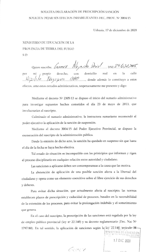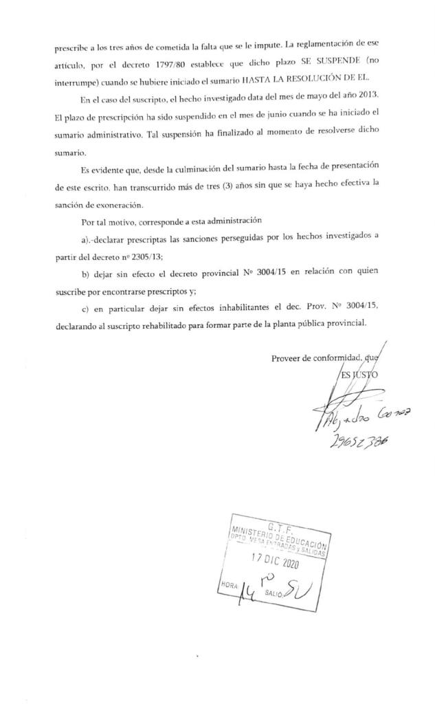 El plazo legal ha operado, por lo que la aplicación de las sanciones está vencida y la exoneración es inoponible. Se cumplieron los cinco años, y durante ese tiempo, el colectivo docente y el sindicato han acompañado en todo sentido a quienes estaban en esta situación. El equipo jurídico estuvo a entera disposición y colectivamente se ha logrado que ninguno de ellos deje de trabajar en la docencia al generarse la posibilidad de ejercer en los Bachilleratos Populares.