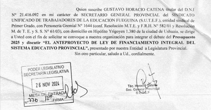 En el marco del paro provincial de la docencia fueguina por aumento salarial, representantes de SUTEF entregaron un pedido de convocatoria a las comisiones de economía y educación de la Legislatura provincial, con el fin de poder dar tratamiento al proyecto de Ley de Financiamiento Integral del Sistema Educativo.