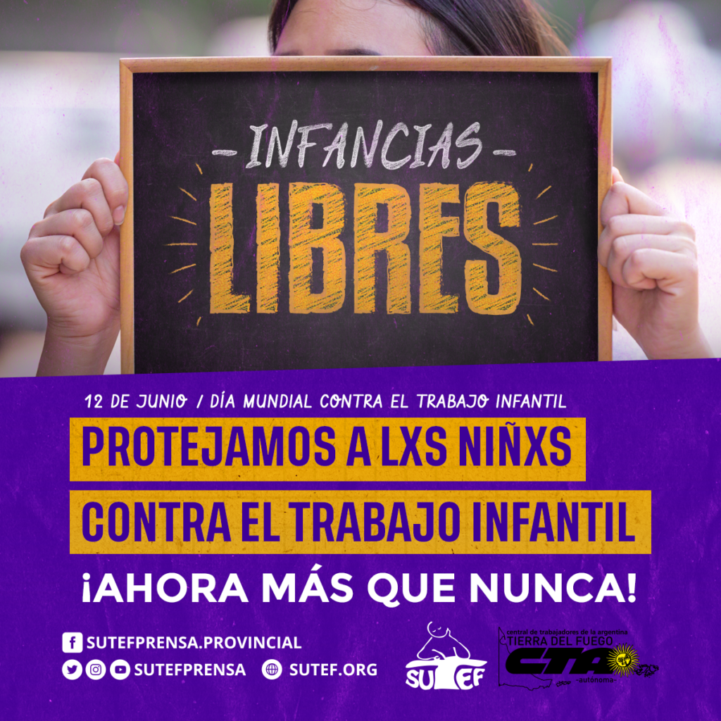 Desde hace 19 años que la Organización Internacional del Trabajo instituyó el 12 de junio como el Día Mundial contra el Trabajo Infantil, con la intención de poner en relieve la gravísima situación que atraviesan millones de niñeces y juventudes en el mundo. En nuestro país las niñas, niños y adolescentes están protegidos mediante la Ley de Contrato de Trabajo (Artículos 187 a 195) y la Ley Nacional N.° 26.390 de «Prohibición del trabajo infantil y la protección del trabajo adolescente».