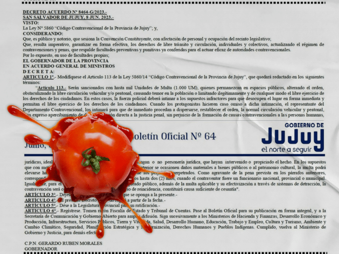 El decreto Nro. 8464 del Poder Ejecutivo provincial, firmado por el gobernador Morales, profundiza la persecución y criminalización de la protesta social en la provincia violando derechos consagrados en la Constitución Nacional (en su Artículo 14 bis) y la Ley Nro. 20.744 de Contrato de Trabajo (artículos 243, 244 y 245). Morales pretende multar, inhabilitar y despedir a las trabajadoras y trabajadores estatales que participen de las protestas.
