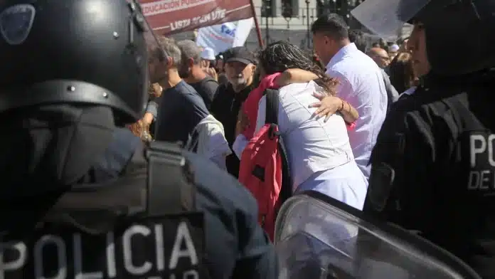 En el marco del paro nacional docente convocado por la Confederación de Trabajadores de la Educación de la República Argentina (CTERA) en defensa de la educación pública, el derechos social a la educación, nuestros salarios y la jubilación docente -a 17 años de la represión policial en Neuquén en la que la policía provincial fusiló al docente Carlos Fuentealba- el jefe de gobierno porteño Jorge Macri desplegó un fuerte operativo policial frente al Congreso, cercando a la movilización y avanzando sobre las personas a bastonazos y arrojando gas pimienta.