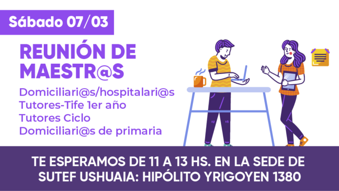 El sábado 7 de marzo se realizará una reunión con Maestr@s Tutores-Tife 1er año, Maestras/os Tutoras/os Ciclo Básico, Maestras/os Domiciliarias/os -hospitalarias/os y Maestras/os Domiciliarias/os de Primaria.