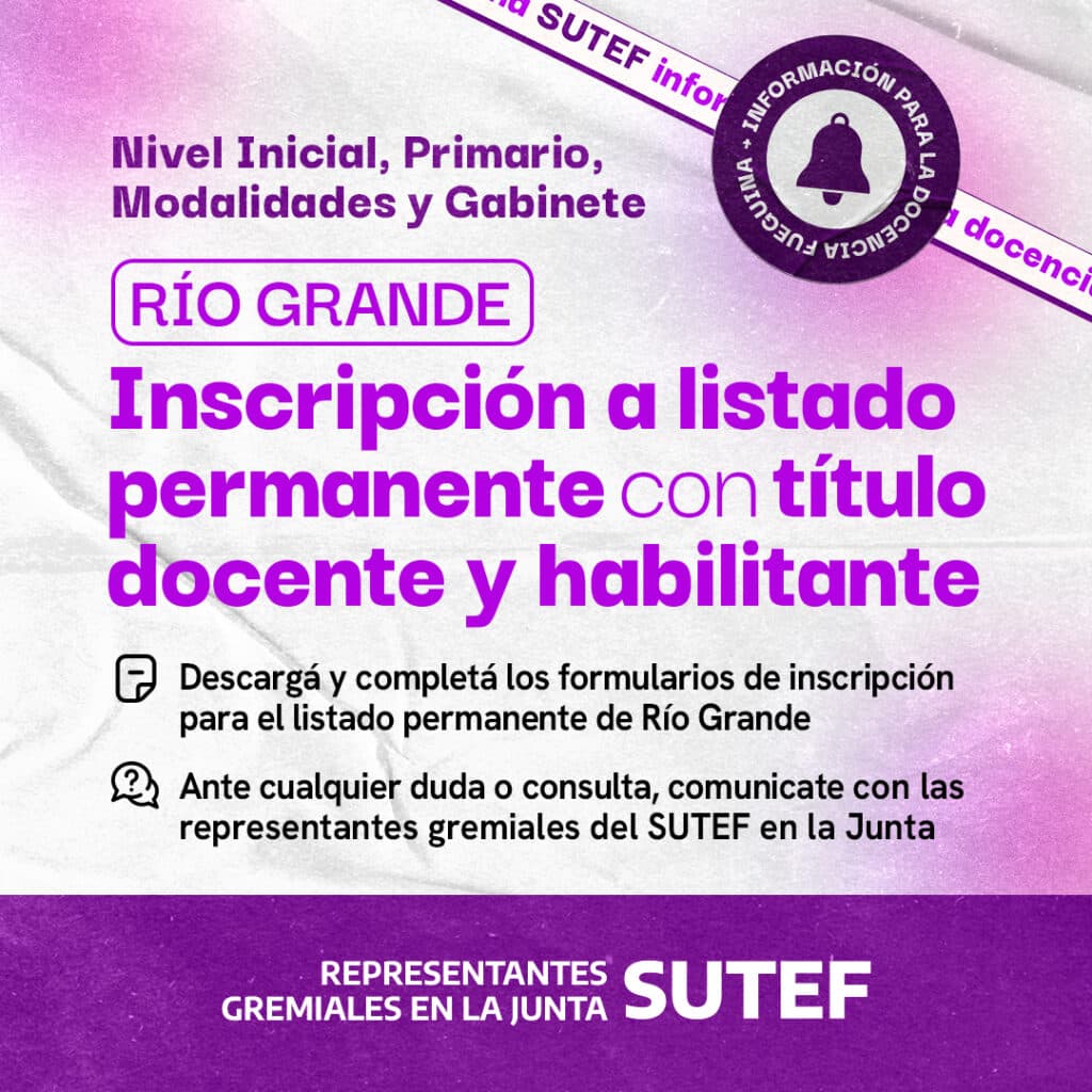 Las representantes gremiales del SUTEF en la Junta de Clasificación y Disciplina de Nivel Inicial, Primario, Modalidades y Gabinete informan que se encuentra abierto el llamado a listado permanente para docentes con título docente y habilitante para el departamento de Río Grande.