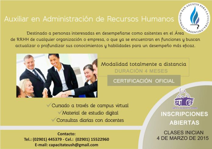 NoticiasFormaciónSe encuentra abierta la inscripción para el curso Auxiliar en Administración de... Se encuentra abierta la inscripción para el curso Auxiliar en Administración de Recursos Humanos publicado el 18 febrero, 2015 FacebookTwitterPinterestWhatsAppEmailImpresiónTelegramCopy URL Últimos artículos Comunicados e informes Informe del congreso provincial de delegadas/os y rectificación de las grillas salariales Este lunes 3 de noviembre, se llevó adelante el congreso provincial de delegadas y... 3 noviembre, 2025 Seguridad Social 07/11 Elecciones obligatorias de la Caja de Previsión Social y OSEF 🗓️ Viernes 7 de noviembre ⏰ De 8.00 y 18.00 hs. 🖥️ Consultá el padrón... 3 noviembre, 2025 Más publicaciones Formación Último encuentro de la capacitación CUESTIÓN MALVINAS 🗓️ El próximo sábado 1 de noviembre se llevará adelante el último encuentro de... 29 octubre, 2025 Formación Capacitación docente «Accesibilidad e Inclusión: un binomio inseparable para la equidad educativa» Invitamos a la docencia de todas las áreas, niveles y modalidades de Tierra del... 27 octubre, 2025 Formación Cuarto encuentro de la capacitación CUESTIÓN MALVINAS El próximo sábado 18 de octubre se llevará adelante el tercer encuentro de "Cuestión... 16 octubre, 2025