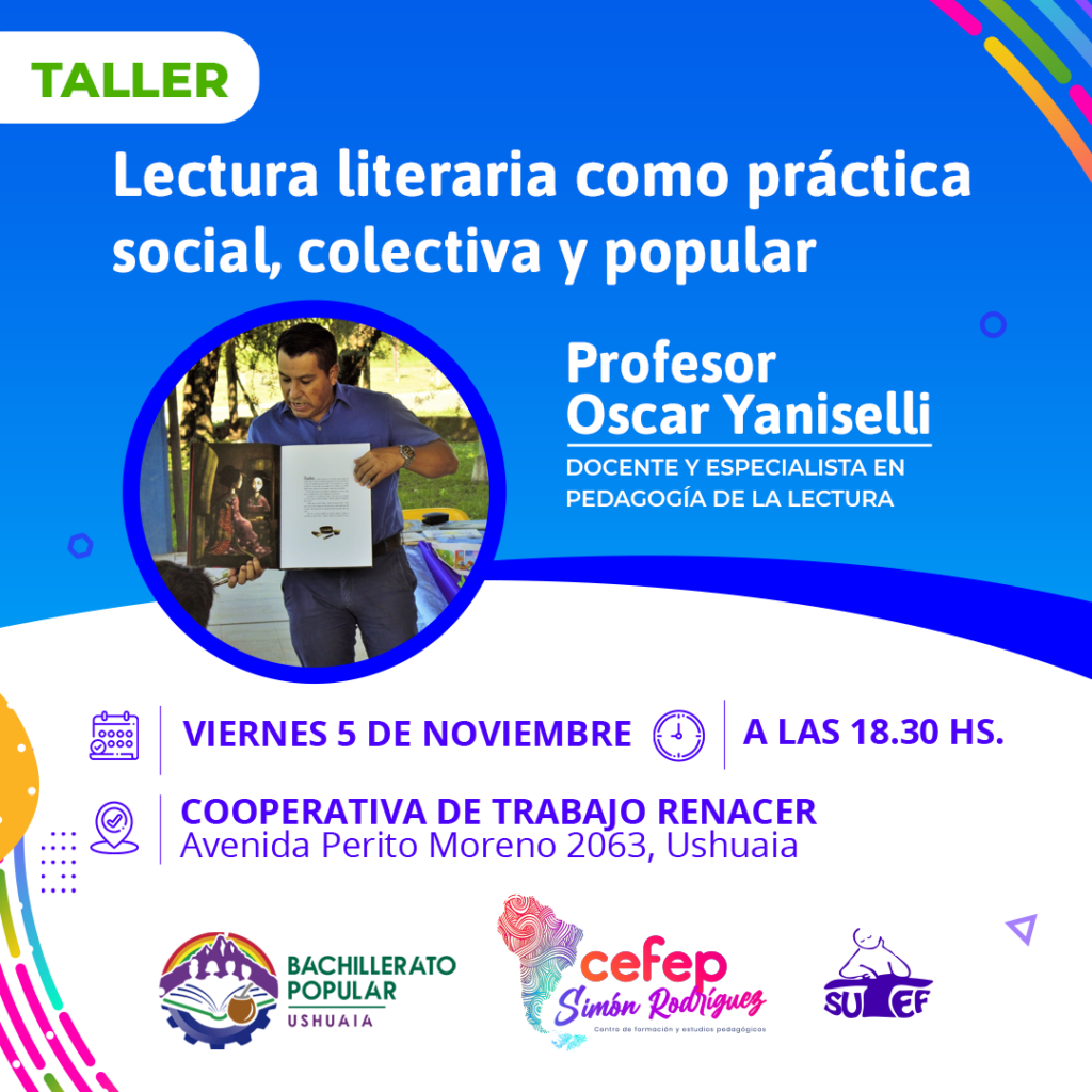 Este viernes 5 de noviembre a las 18.30 hs., el Profesor Oscar Yaniselli realizará el taller «Lectura literaria como práctica social, colectiva y popular» en el Bachillerato Popular de Ushuaia en la Cooperativa de Trabajo Renacer, Av. Perito Moreno 2063 en Ushuaia