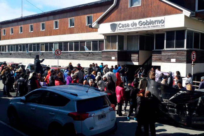 En tanto en la capital fueguina, a pesar de las condiciones climáticas un nutrido grupo de manifestantes, con una marcada presencia de docentes, marcharon hacia Legislatura y Casa de Gobierno. En el edificio de los Bloques, personal policial impidió el ingreso de los dirigentes sindicales y jubilados cuya intención era dialogar con los parlamentarios. Los oficiales informaron que no se podía ingresar, que la única legisladora que se encontraba en el lugar era Martinez Allende, pero que ya les había dicho que no iba a recibir a nadie. Los manifestantes repudiaron esta actitud y continuaron marchando a Casa de Gobierno donde dirigentes de SUTEF, ASEOM, SEOM, AFEP, SEJUP, Centro de Jubilados AKAINIK y Jubilados Autoconvocados, realizaron discursos repudiando al Gobierno Provincial y llamando a la unidad y a la solidaridad. Raúl Arce, Secretario Gremial del SUTEF y Secretario Adjunto de la CTA Autónoma de Tierra del Fuego señaló que la única responsable de la situaciòn actul del IPAUSS, del pago desdoblado a jubilados y de que la obra social no funcione a pleno es la patronal, poderes ejecutivos gubernamentales, municipales y poder legislativos que no hacen los aportes correspondientes. «La patronal es responsable porque no hace los aportes que tiene que hacer, eso es lo que nos tiene como nos tiene, la falta de envío de fondos que son parte de nuestro trabajo diferido. Las contribuciones patronales para los privados es una obligación porque sino le clausuran cada uno de sus comercios o emprendimiento; sin embargo en el estado, encima los premian como presidentes de fondos fiduciarios o gerentes de algún banco».- remarcó Arce.