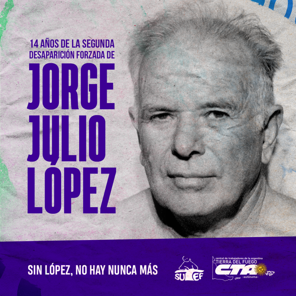 ¡Aparición con vida de Jorge Julio López! ¡Basta de silencio, encubrimiento e impunidad! ¡El Estado es responsable! ¡Juicio y castigo a los responsables políticos y materiales de su desaparición! ¡Cárcel común, perpetua y efectiva a todos los genocidas!