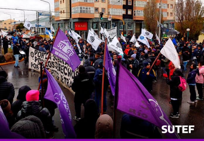 SUTEF acompañó la movilización de las obreras y obreros del sector metalúrgico de la ciudad de Río Grande, en el marco del paro resuelto por el Congreso de Delegados/as de la UOM en rechazo al DNU, al megaproyecto de Ley Bases y su artículo 111 que que permitiría modificar el régimen de promoción industrial 19.640.