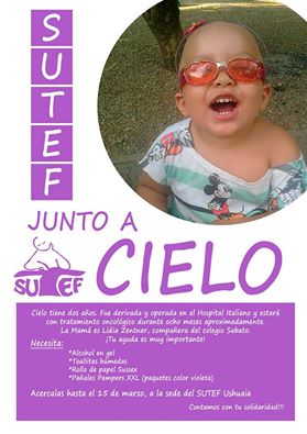 Cielo es una niña de 2 años que fue derivada y operada en el Hospital Italiano y estará en tratamiento oncológico durante 8 meses aproximadamente. su mamá es una compañera que trabaja en el Colegio Ernesto Sábato de Ushuaia. La ayuda de todos nosotros es muy importante. Necesitamos alcohol en gel, toallitas húmedas, rollos de papel Sussex y pañales Pampers XXL (paquetes de color violeta). Comenzaremos a recibir donaciones el día 22 y 23 en los actos públicos y en el sindicato de 10 hs a 16 hs hasta el día 15 de marzo. Agradecemos tu colaboración.