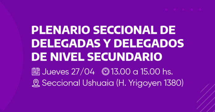 SUTEF convoca a Plenario Presencial de Delegadas y Delegados del Nivel Secundario de la ciudad de Ushuaia el jueves 27 de abril de 13 a 15 hs. en la Seccional, Hipólito Yrigoyen 1380 con el objetivo de trabajar sobre el siguiente temario: