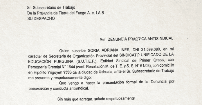 SUTEF denuncia en el Ministerio de Trabajo persecución y conducta antisindical en distintos establecimientos educativos, a través de Ministerio de Educación, informando como paro de actividades (paro por horario determinado), ordenando descuentos y descontando del recibo de haberes actividades sindicales de trabajadoras y trabajadores que no han constituido medidas de fuerzas ni afectado el cumplimiento de la jornada de clases.