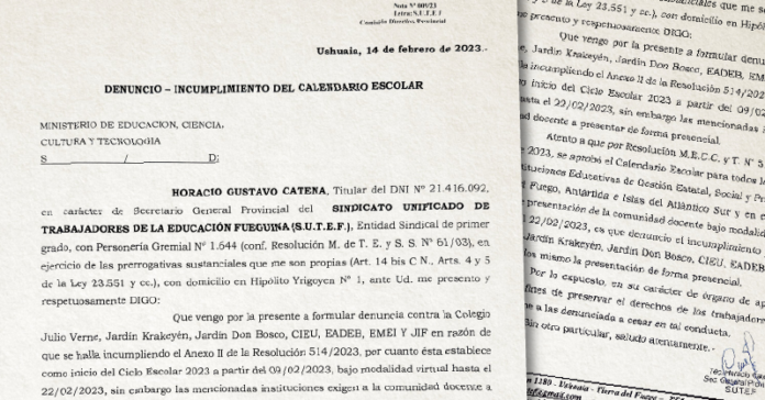 Este martes 14 de febrero, el Sindicato Unificado de Trabajadoras y Trabajadores de la Educación Fueguina (SUTEF) denunció ante el Ministerio de Trabajo de la Provincia y el Ministerio de Educación al Colegio Julio Verne, Jardín Krakeyén, Jardín Don Bosco, Colegio Integral de Educación Ushuaia (CIEU), la Escuela Austral de Enseñanza Bilingue (EADEB), la Escuela Modelo de Educación Integral (EMEI) y al Juvenil Instituto Fueguino (JIF) por incumplimiento del calendario escolar 2023.