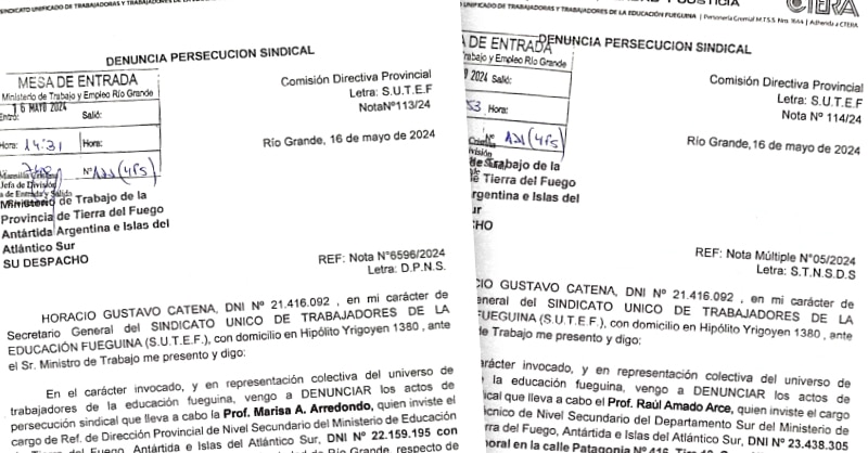 SUTEF denunció por persecución sindical a la referente de la Dirección Provincial de Nivel Secundario, Marisa Arredondo, por el envío de la Nota de Referencia 6596/24; y al Supervisor Técnico de Nivel Secundario, Raúl Arce, por el envío de la Nota Múltiple Nro. 05/24 replicada ilegítimamente hacia todos los establecimientos educativos del nivel y la ciudad de Ushuaia.