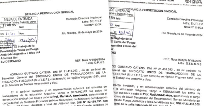 SUTEF denunció por persecución sindical a la referente de la Dirección Provincial de Nivel Secundario, Marisa Arredondo, por el envío de la Nota de Referencia 6596/24; y al Supervisor Técnico de Nivel Secundario, Raúl Arce, por el envío de la Nota Múltiple Nro. 05/24 replicada ilegítimamente hacia todos los establecimientos educativos del nivel y la ciudad de Ushuaia.
