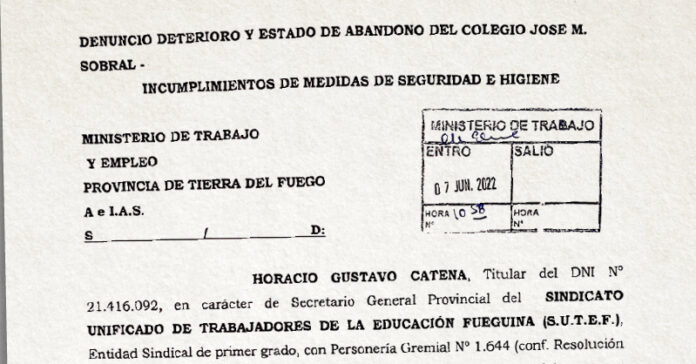 En el día de hoy, martes 7 de junio, SUTEF denunció al Ministerio de Educación de la Provincia de Tierra del Fuego AIAS por el deterioro y estado de abandono del Colegio José M. Sobral y porque no están garantizadas las condiciones de seguridad e higiene en el ámbito laboral, en clara violación a la garantía constitucional art. 14 bis que establece que el empleador debe brindar condiciones dignas de trabajo, 75 inc. 22, Ley 19.587 art. 8 y 9 y los 12 puntos sobre infraestructura escolar acordados en Paritaria Nacional.