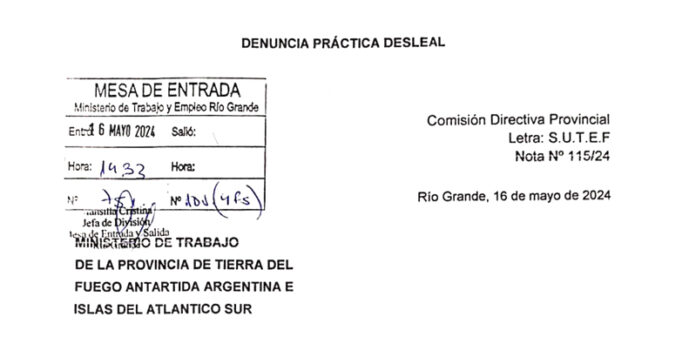 El pasado jueves 16 de mayo, el Sindicato Unificado de Trabajadoras y Trabajadores de la Educación Fueguina (SUTEF) denunció por práctica desleal al Ministerio de Educación de la provincia.