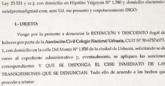 El pasado miércoles 8 de marzo, el Sindicato Unificado de Trabajadoras y Trabajadores de la Educación Fueguina (SUTEF) denunció ante el Ministerio de Trabajo a la Asociación Civil Colegio Nacional Ushuaia, ya que esta empresa privada retuvo a docentes una suma significativa en la liquidación final en concepto de descuento preaviso.