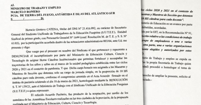 En la primera, se denuncia el incumplimiento por parte del Ministerio de Educación del acta acuerdo homologada en la cual se establece el otorgamiento de 10 horas cátedras institucionales a cada maestra de sección que tengan solo un cargo. Se solicita a la cartera laboral se expide «teniendo en cuenta que fue la propia Secretaría de Trabajo quien realizando los controles indicados (legalidad y oportunidad) procedió a homologar el tema de referencia».