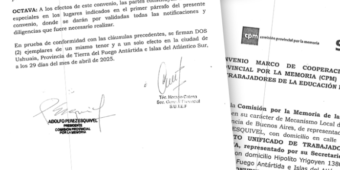 El entendimiento lleva la firma de Adolfo Pérez Esquivel, Premio Nobel de la Paz y presidente de la Comisión Provincial por la Memoria (CPM), y Horacio Catena, secretario general provincial de SUTEF.