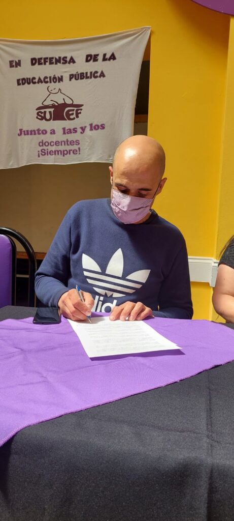 Luego de reuniones previas, se concretó la firma del convenio que consiste en que ambas organizaciones colaborarán mutuamente para llevar adelante actividades de formación pedagógica y de investigación con la colaboración del Centro de Formación y Estudios Pedagógicos “Simón Rodríguez” del SUTEF.