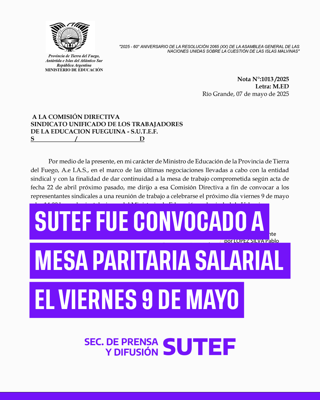 En el día de la fecha, miércoles 7 de mayo, el Ministro de Educación convocó al Sindicato Unificado de Trabajadoras y Trabajadores de la Educación Fueguina (SUTEF) a Mesa Paritaria Salarial, tal como fue acordado en el acta paritaria del 22 de abril.