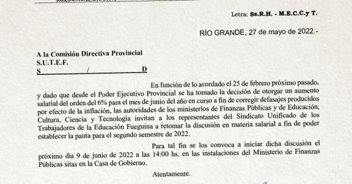 El pasado viernes 27 de mayo, el Ministerio de Educación, Cultura, Ciencia y Tecnología de la Provincia notificó al SUTEF de la convocatoria a reunión en el marco de las paritarias, Ley N.° 424, el día jueves 9 de junio a las 14.00 horas. La misma se realizará en el Ministerio de Finanzas.