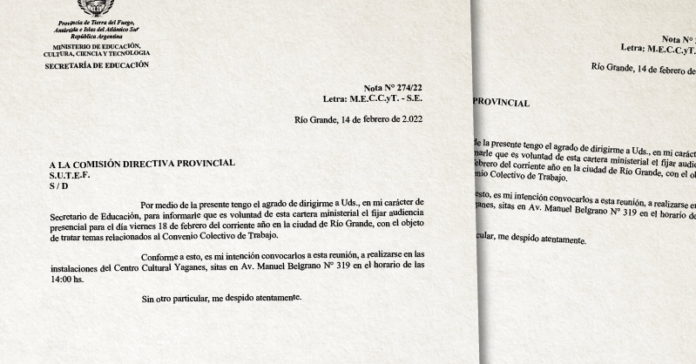 Estimados compañeros y compañeras: tal como se había acordado en la mesa del 7 de febrero del 2022, durante el día de hoy el SUTEF fue notificado de la convocatoria Mesa Técnica de Convenio Colectivo de Trabajo (CCT) para el día viernes 18 de febrero a las 14 horas. La misma se realizará en el Centro Cultural Yaganes de la ciudad de Río Grande.