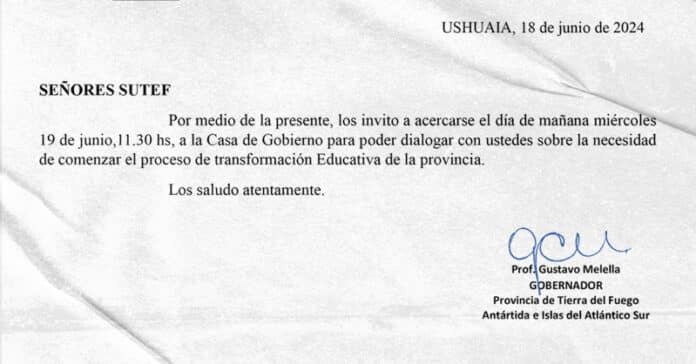 En el día de la fecha, el Sindicato Unificado de Trabajadoras y Trabajadores de la Educación Fueguina, SUTEF, recibió la convocatoria a una reunión con el Gobernador de la Provincia.