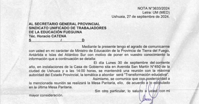 El viernes 27 de septiembre, el Sindicato Unificado de Trabajadoras y Trabajadores de la Educación Fueguina (SUTEF) fue convocado a una reunión con el gobernador de la provincia, Gustavo Melella, y autoridades del Ministerio de Educación.