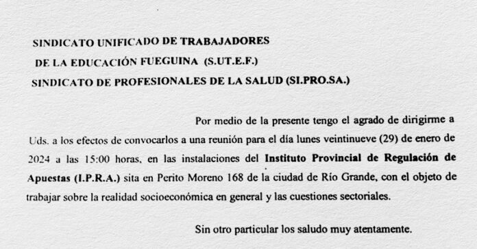 Durante la tarde del día de ayer, viernes 26 de enero, el Sindicato Unificado de Trabajadoras y Trabajadores de la Educación Fueguina (SUTEF) fue convocado por el Gobernador de la provincia a participar de una reunión a desarrollarse el día lunes 29 de enero.