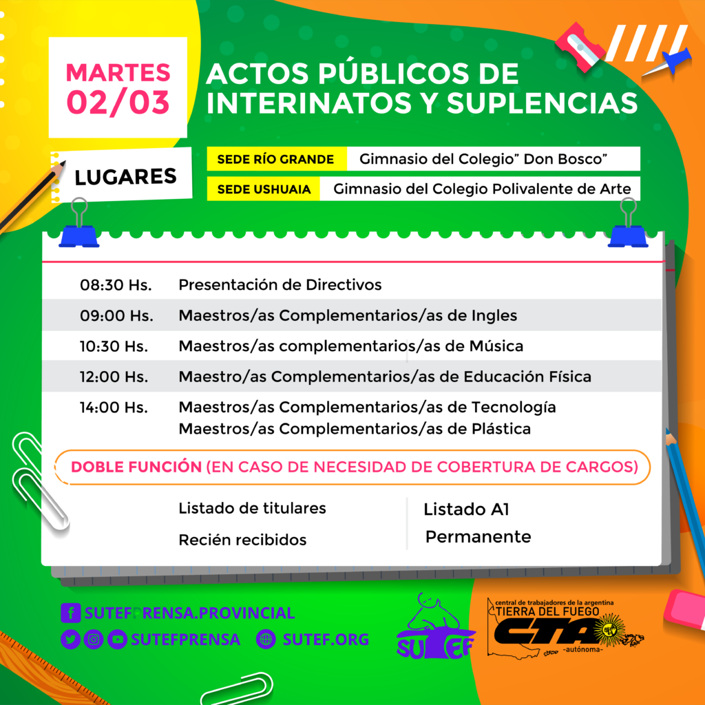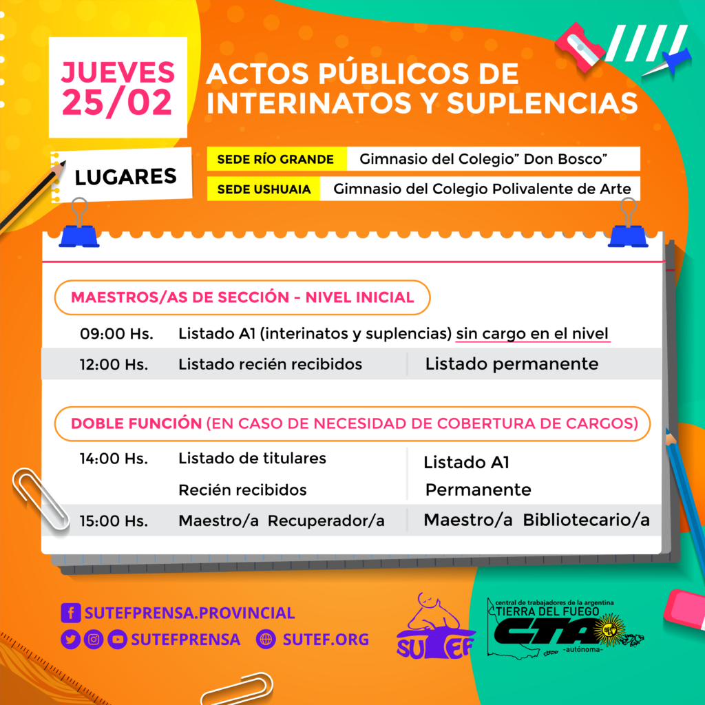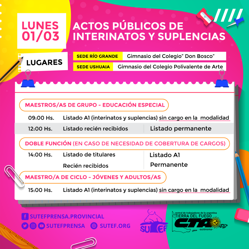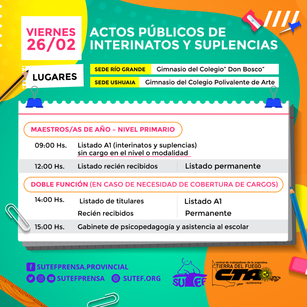 NoticiasSUTEF Informa: actos públicos SUTEF Informa: actos públicos publicado el 24 febrero, 2021 FacebookXPinterestWhatsAppEmailImpresiónTelegramCopy URL Atención docentes de inicial, primaria y modalidades: ¡lugares y horarios de actos públicos! Últimos artículos Noticias OSEF: el Frente Lila presentó proyecto de ley para recuperar la autarquía El Frente Lila, a través de las actuales vocales por el sector activo en... 26 marzo, 2026 Comunicados e informes 50 años del golpe genocida: ¡QUE DIGAN DÓNDE ESTÁN! Se cumplieron 50 años del inicio de la etapa más oscura de nuestra historia.... 25 marzo, 2026 Más publicaciones Noticias OSEF: el Frente Lila presentó proyecto de ley para recuperar la autarquía El Frente Lila, a través de las actuales vocales por el sector activo en... 26 marzo, 2026 Noticias Gutiérrez: orden ilegal y persecución a la docencia Desde el Sindicato Unificado de las Trabajadoras y Trabajadores de la Educación Fueguina (SUTEF)... 17 marzo, 2026 Noticias Se conformó el Frente Nacional Democrático por la Educación Pública En un contexto de crisis educativa y laboral, se llevó a cabo el primer... 15 diciembre, 2025