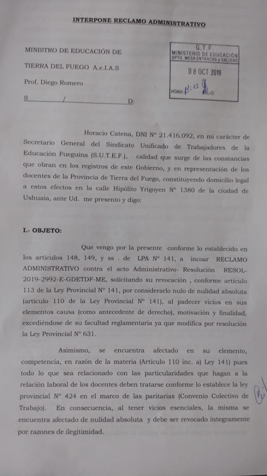 SUTEF interpone un reclamo administrativo al Ministro de Educación debido a la ilegítima resolución del decreto de Titularidad.