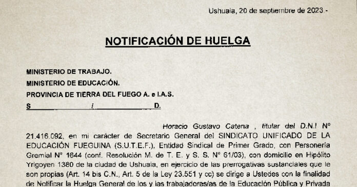 El Sindicato Unificado de Trabajadoras y Trabajadores de la Educación Fueguina (SUTEF) notificó a los Ministerios de Trabajo y Educación de la huelga general de la docencia de Educación Pública y Privada de la Provincia de Tierra del Fuego, Antártida e Islas del Atlántico Sur.