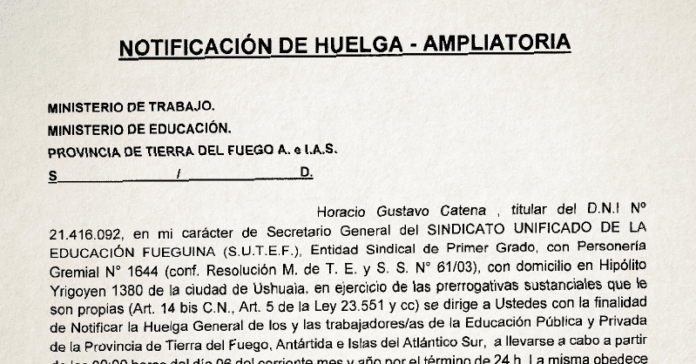 El Sindicato Unificado de Trabajadoras y Trabajadores de la Educación Fueguina (SUTEF) notificó a los Ministerios de Trabajo y Educación de la huelga general de la docencia de Educación Pública y Privada de la Provincia de Tierra del Fuego, Antártida e Islas del Atlántico Sur.