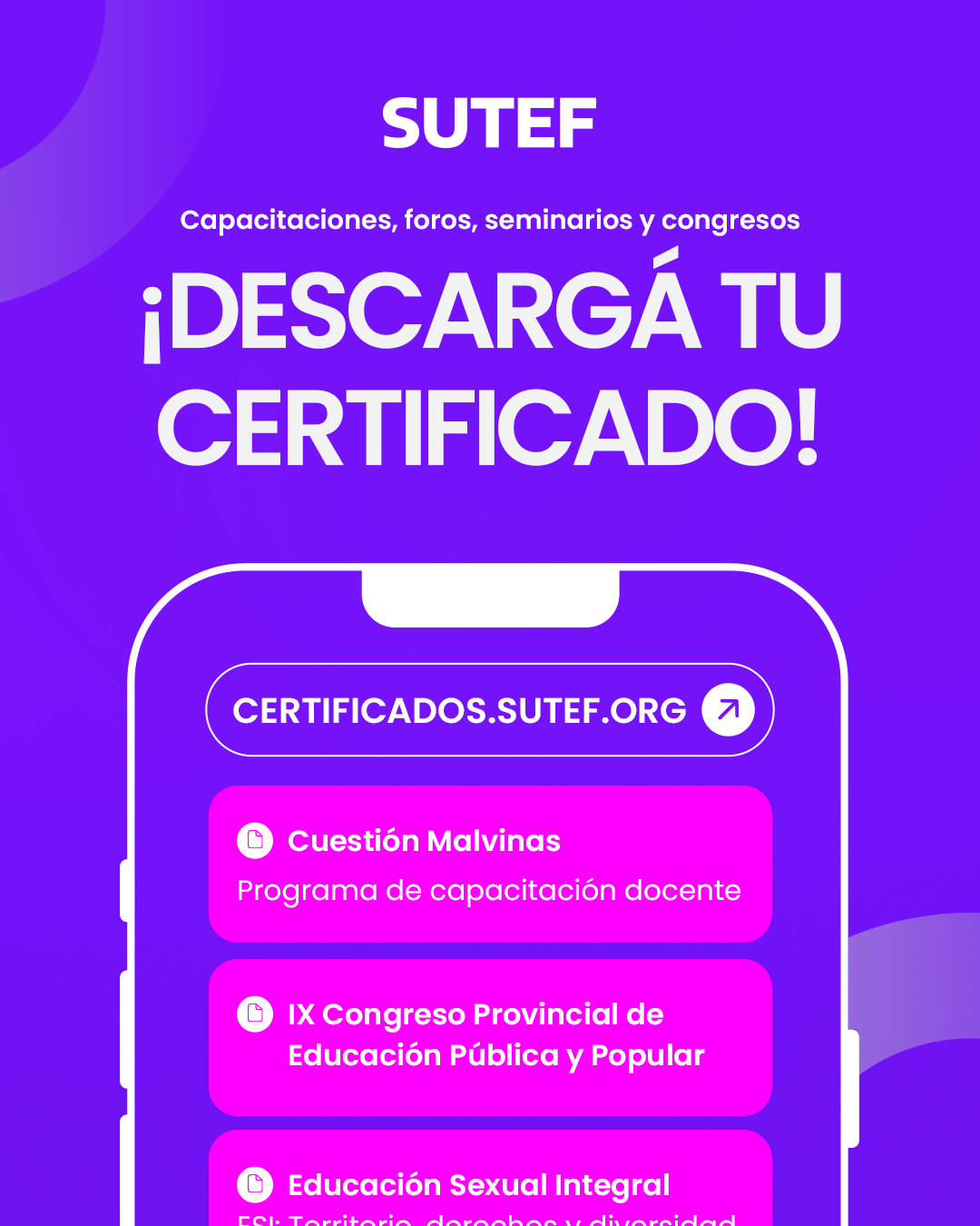 Desde el Sindicato Unificado de las Trabajadoras y Trabajadores de la Educación Fueguina (SUTEF), informamos a toda la docencia de la provincia que ya se encuentra en pleno funcionamiento el portal web destinado a la descarga de certificados correspondientes a nuestras instancias de formación, foros, seminarios y congresos.