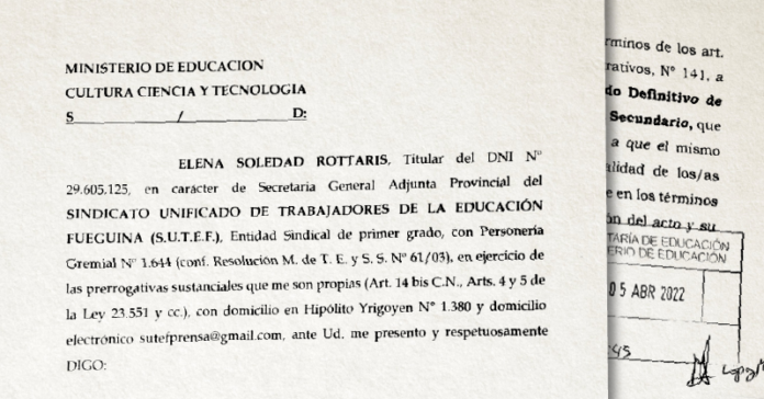 En el día de la fecha, martes 5 de abril, SUTEF realizó reclamo administrativo al Ministerio de Educación, contra el Listado Definitivo de Interinatos y Suplencias Ciclo Lectivo 2022 de Nivel Secundario publicado el lunes 04 de abril de 2022, debido a que el mismo presenta innumerables errores afectando a la generalidad de las y los docentes, solicitando la suspensión de la ejecución del acto y su inmediata rectificación a fin de garantizar la legitimidad del acceso al cargo base y horas cátedra.