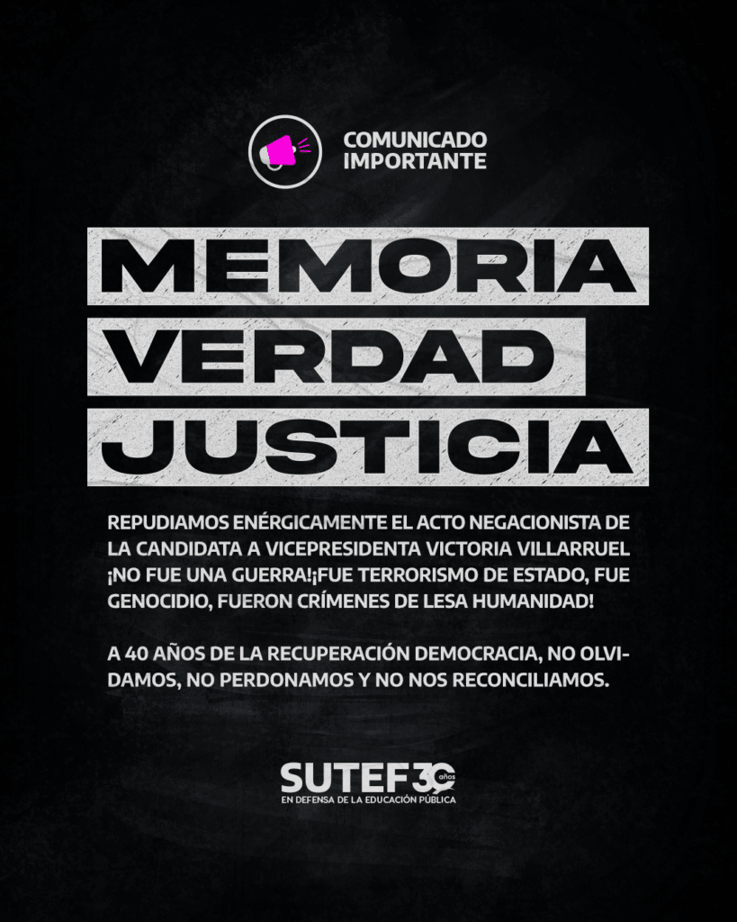 Desde el Sindicato Unificado de Trabajadoras y Trabajadores de la Educación Fueguina, SUTEF, expresamos nuestro más enérgico repudio al acto negacionista de la última dictadura cívico, eclesiástica y militar convocada por la candidata a vicepresidenta de la Nación Victoria Villarruel por el partido la Libertad Avanza.